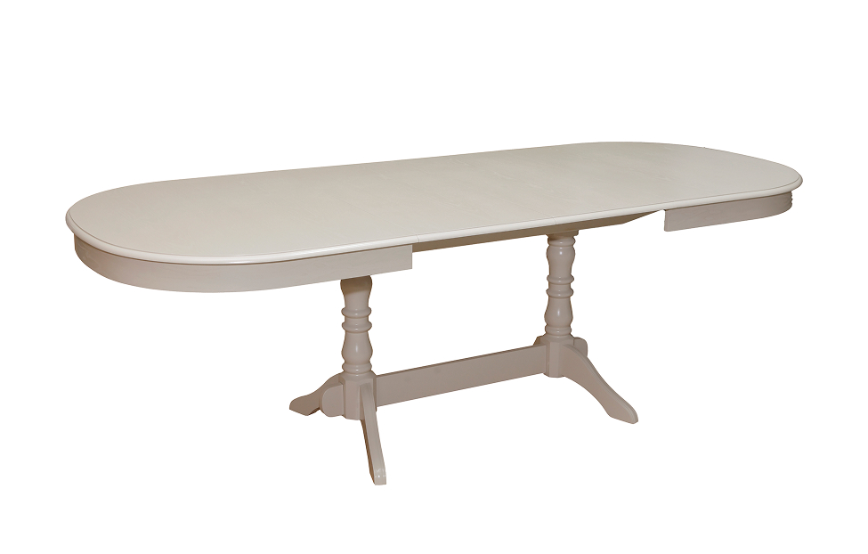 Изящный овальный стол в молочном цвете с фигурными ножками подойдет для обстановки прованс или неоклассика. Столешница выполнена из МДФ, облицованной ясеневым шпоном, и имеет встроенный механизм трансформации с неразрезной вставкой. Металлические элементы изготовлены из нержавеющей полированной стали. После трансформации длина стола увеличивается почти в полтора раза, достигая 240 см.